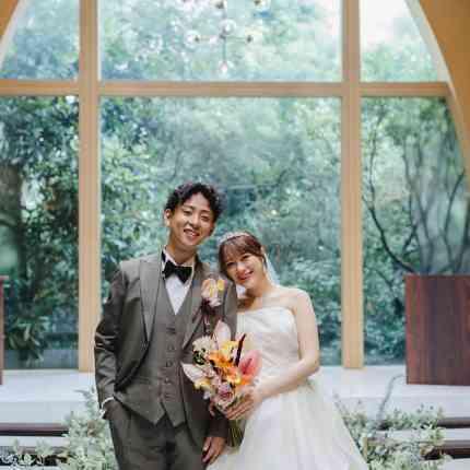 自然光が差し込み、明るく開放感があるベイサイドパーク迎賓館の森のチャペル。天井も高く、開放的な空間で、ゲストにも好評でした。また、ふたりらしい挙式にするために人前式を選択、リングセレモニーや、挙式時のフラワーシャワーなど、ゲストに参加してもらえ、かつ一体感のある挙式の時間となりました。みんなとの距離が近く、アットホームな空間でした。