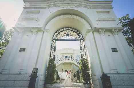 【フォトスポット】入口の大きな凱旋門の前でふたりのスナップを。貸切の会場を贅沢に使ってふたりだけの撮影も楽しめる!他にはプール付きガーデンでのスナップもあり、青空の下で開放感たっぷりのフォトがたくさん!