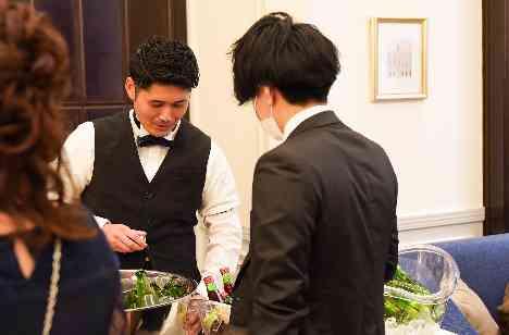【サプライズ演出】新郎がスタッフに扮して、ゲストにドリンクを提供♪ゲストとの会話も弾む楽しい演出に!【新郎新婦もゲストと一緒に楽しむ披露宴】披露宴会場はアットホームな雰囲気に。装飾のテーマは「Sea×Relaxing」にし、海をイメージしたコーディネートになりました♪会場内のゲストも自然とリラックス♪