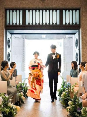 日本の伝統的なお衣裳を身にまとい、大切なゲストのみなさまにおふたりの誓いの証人になっていただく、和婚人前式。、「帝冠様式」という洋風の建物に和風瓦の屋根をもつ、西洋と東洋を融合させたレトロモダンな姿の九段会館テラスなら、ドレススタイルはもちろん和装姿も引き立てます。