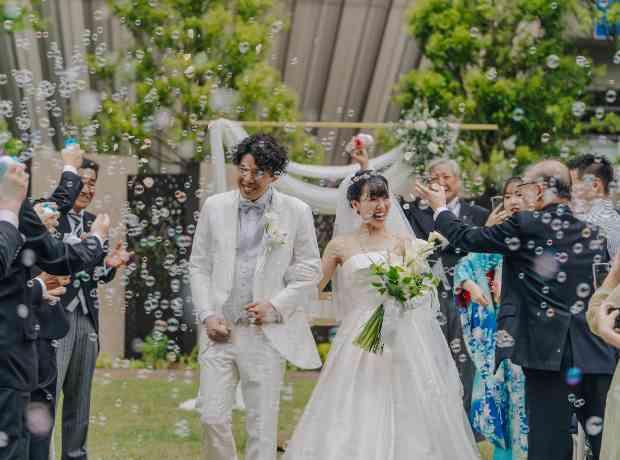当日はお天気に恵まれ、新緑がまぶしいガーデンウエディング日和に。ゲストとの結びつきを感じたいと、人前式を選ばれたおふたり。開放的なガーデンウエディングだからこそ、自然体で笑顔にあふれたアットホームな挙式となりました。退場時には、フラワーシャワーとしゃぼん玉シャワーで華やかに祝福。どこを切り取っても絵になる、フォトジェニックなセレモニーとなりました。