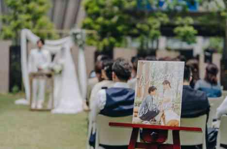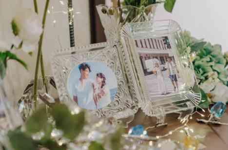 ゲストをお出迎えするウエルカムスペースには、新郎様新婦様のお仕事にちなんだアイテムを取り入れられました。フラワーを生けたグラスは、新婦様がデザイナーさんとはじめて開発をされた、特別な思い入れのある品だそう。また存在感のあるフォトフレームは、鉄筋工事業を営む新郎様が手作りされたもの。お仕事に誇りを持つおふたりだからこそ、こだわりとアイデアのつまったとっておきの空間を表現されました。