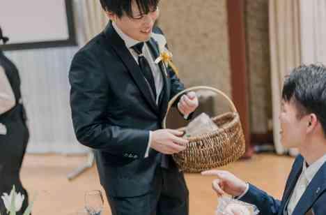 ウェディングケーキのセレモニー後、おふたりが各テーブルをまわり、プチギフトを手渡しながら、一人ひとりに感謝の気持ちを丁寧に伝える時間を設けられました。 このプチギフトの中には、実はトランプのカードが1枚ずつ入っており、ここにおふたりの“遊び心”が込められていました。再入場後、おふたりが引いたカードと同じ絵柄を持つゲストに、特別なプレゼントを贈呈。予想外の楽しい演出に、笑顔と歓声に包まれました。