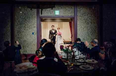 新郎様はブラックのタキシード、新婦様は袖付きのレトロなウエディングドレスをお召しに。フラワーコーディネートはオレンジや赤、バラの実を用いた秋らしい色合いで、会場に調和したクラシカルな雰囲気を演出されました。お色直し後は、新郎様はベージュのシャツ、新婦様はゴールドのドレスにチェンジ。柔らかな色味を基調とした、より秋らしく上品な装いとなりました。