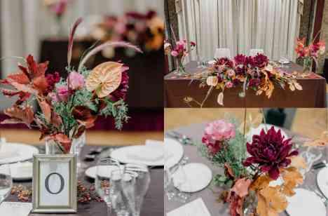 新郎様はブラックのタキシード、新婦様は袖付きのレトロなウエディングドレスをお召しに。フラワーコーディネートはオレンジや赤、バラの実を用いた秋らしい色合いで、会場に調和したクラシカルな雰囲気を演出されました。お色直し後は、新郎様はベージュのシャツ、新婦様はゴールドのドレスにチェンジ。柔らかな色味を基調とした、より秋らしく上品な装いとなりました。