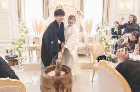 賑やか楽しい雰囲気でゲストの方々に楽しんでいただくことを意識しました。 まず、和装に着替えて入場し、ケーキ入刀の代わりに、餅つきを行いました。 お色直し後の再入場では、ゲストの方にペンライトやうちわを持ってもらい、歌いながら入場しました。 席札やプロフィールブック、動画など、手作りできるものは全て手作りし、私たちらしい・オリジナリティ溢れる披露宴になったと思います。