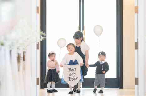 新婦と新婦の両親だけでなく、新郎にも主役であって欲しい、新郎のご両親にもスポットを当てたいと思い、新郎の身支度を整えてもらうジャケットセレモニーと、ブートニアセレモニーを行いました。 また、リングボーイ・リングガールを甥と姪にお願いしました。 タペストリー、リングの入ったカゴ、風船をそれぞれに持ってもらい、とても可愛かったです。 どちらの演出もゲストから好評でした。