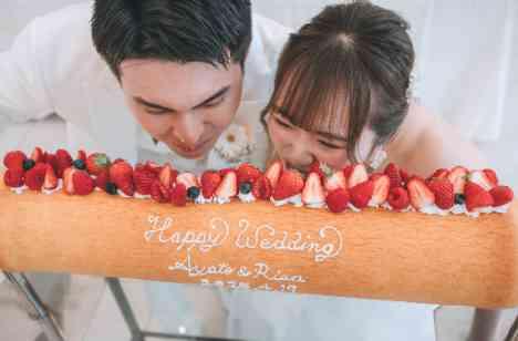 ウェディングケーキはバームクーヘンを1本で準備していただきました。 ケーキ入力とファーストバイトの代わりに、バームクーヘンに一緒にかぶりつきました。 2人でやりたいと思っていたことの1つだったので、結婚式で取り入れられて嬉しかったです。 両親にサンクスバイトをする予定でしたが、急遽2人にもバームクーヘンにかぶりついてもらうことに変更し、私たちだけでなく皆にも楽しんでもらえた演出となりました。
