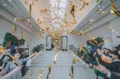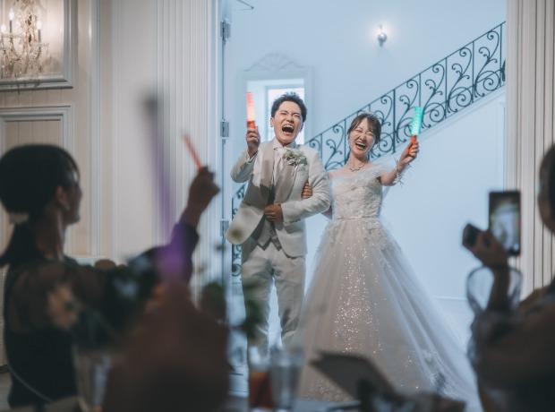 フラワーシャワーをシャボン玉にしたり、銀テープを飛ばしたり、ライブのような演出にこだわりました。 銀テープはまるでライブのような盛り上がりで、ゲストが楽しそうにキャッチしてくれたり、集めて写真を撮ってくれて嬉しかったです。 また、披露宴後にもゆっくり写真を撮ることができ、結婚式オフショットのような仕上がりになり満足です。