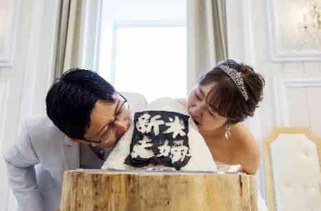 「ゲストと近く、楽しむこと」をモットーにしていたので、ウェルカムパーティーやデザートビュッフェでは新郎新婦がゲストの近くに寄り、自由に動けるようにしました。 そのため、ゲスト全員と話をする時間を設けることができ楽しめたし、和気あいあいとした自然な笑顔の写真を残すことができたと思います。 また、ケーキ入刀の代わりに、ビッグおにぎりかじりつきをし、ゲストからも笑いが起き楽しかったです。