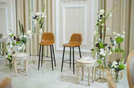 披露宴会場の雰囲気は、まず白と緑と決めて進めました。 装花などもそれに合わせてナチュラルな雰囲気にしていただきました。装花の担当者の方のセンスがすごく良くて、あまり見ないような個性的でおしゃれな雰囲気になっていたと思います。 また、高砂はハイチェアでテーブル無しにしました。たくさん悩んで選んだドレスやタキシードがしっかりと写真などに写るので良い選択でした。