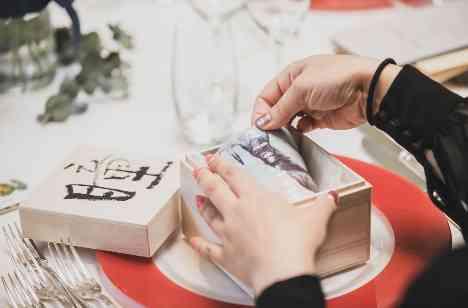 少人数だからこそひとりひとりに想いをつたえたい。そんな気持ちでご準備を進められたおふたり。引出物には、ゲストひとりひとりのお名前が書かれた桐の箱に入った陶器を席札にしてプレゼント。みなさんお写真を撮られたり、当期も一人一人異なるので、見せ合ったりと喜んでいただけました。おふたりが一人一人をを想って選んだ品。想いが届けられた瞬間でした。