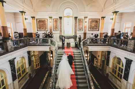 おふたりが結婚式に選ばれたのはレストランのすぐ近くにある大正時代に建てられた重厚感のある重要文化財「名古屋市市政資料館」中央階段を皆様に見守られてお父様と入場。おふたりにとっても、ゲストにとっても忘れられない、印象深い1日。外には、桜も咲いており、桜を見るたびにこの日を思い浮べていただけたら。その後のみなさんで移動してレストランへ。