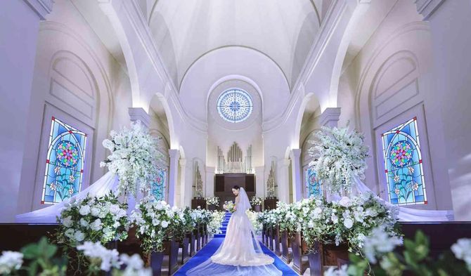 ステンドグラスが輝く祭壇へ導くのは、海や空のように「永遠」を意味するロイヤルブルーのバージンロード。ゆっくり歩む花嫁の姿は感動的で、ゲストも思わず涙するほど…。さらに、365日フラワーシャワーが叶う憧れの大階段、ペットの一緒にガーデン挙式ができるのも魅力♪
