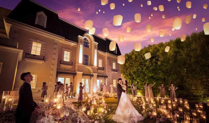 邸宅内はもちろん、屋外ガーデンも貸切にできる自由なパーティ。広大な敷地を活かしたウエルカムパーティビュッフェは、おもてなし重視のふたりにおすすめ。季節に合わせたフードや生ハムカットがずらりと並び、美味しく楽しいプライベートタイムをゲストへ贈ることができる。
