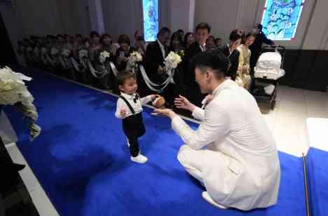 ロイヤルブルーの大聖堂での本格挙式はピーンと張りつめた少し緊張する空間。そんな緊張をほぐしたのはおふたりのお子様によるリングボーイの演出。よちよちとパパとママ向かって一生懸命歩く姿に、扉が開いた瞬間から「かわいい~」と方々から声が上がり、チャペルの空間が一気に和やかになる瞬間でした。無事にリングを届けられて一安心。おふたりは聖壇の上で無事に指輪を好感しました。