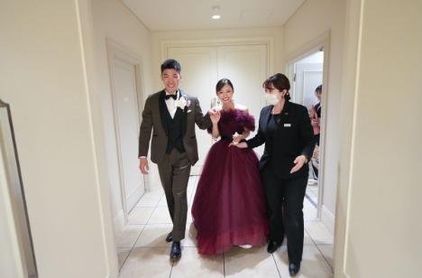 ご新婦はドレスにもこだわり、ご新郎も一緒に何度も打ち合わせを重ね、妥協することなく、お気に入りの2着をお選びになりました。 1着目は、お花の刺繍が入っていて、シンプルながら程良く華やかさのあるところに惹かれて選んだそう。取り外し可能なベールが付いており、挙式と披露宴で違った着こなしを楽しんでいらっしゃいました。 2着目は、バーガンディー色のカラードレスで、大人っぽい雰囲気が大変お似合いでした。