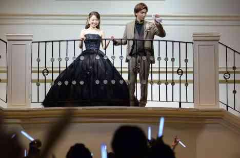 披露宴では、会場の大階段を活かし、照明を落とした中での入場演出を取り入れました。ご新婦は、プリンセスラインで可愛さとかっこよさを両立し、「あなた以外の色に染まりません」という意味を持つブラックのドレスにお色直しをされて再入場。ゲストが持つサイリウムが綺麗に光り、ライブ会場のような景色が広がりました。装花はカラードレス用のブーケに合わせ、白・ベージュ・茶色のドライフラワーを使ったコーディネートです。