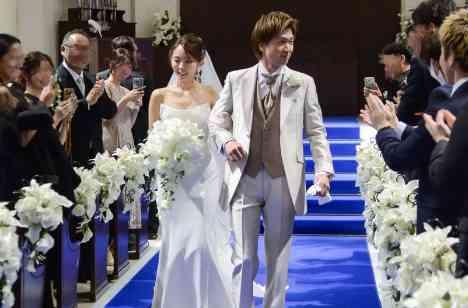 式場決定の理由にもなった、ご新婦が高校生の頃から憧れていたという青いバージンロードが特徴のチャペルです。当日は雨天ながらも、光を調整できるステンドグラスにより、明るく綺麗な空間での挙式が叶いました。バージンロードに映えるようにとこだわった長めのトレーンも美しく、オフショルダーでマーメイドラインのドレスを着こなすために、身体作りまで努力されたご新婦の想いが実った瞬間です。