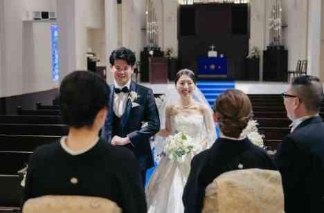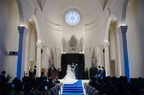 ご新婦は「木目調の温かな雰囲気より、白を基調としたスタイリッシュな雰囲気が好み」とのことで、当チャペルの白い内装とステンドグラス越しに寒色系の光が入るところに惹かれ、当式場を選ばれています。 当日は、青いバージンロードにロングトレーンのウェディングドレスがひと際映えていました。聖壇には高さがあるので、参列者席の足元近くまでドレスが広がり、ゲストの皆様にもしっかりとご覧いただけたと思います。