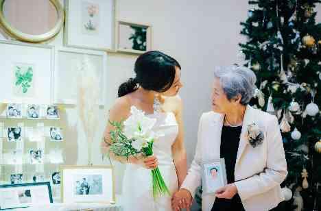 小さい頃から大好きだった祖父母。いろんな所に連れていってもらったり、今では旅行に行く程の仲良しで新婦の一番の理解者。結婚式をやろうと決めた時、大好きな祖父母にエスコートをお願いすると唯一決まっていたそう。祖母の手には新婦が大好きだった祖父の遺影。祖母と手をしっかり繋いで歩く新婦の姿に、ゲストも感動の涙!