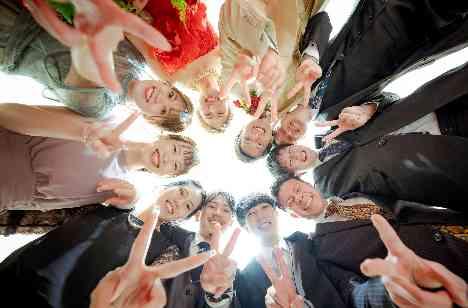 お二人の出会いは中学校の時。 当時から仲良くたくさんの仲間に囲まれ、今日まで過ごしてきた新郎新婦様のまわりには地元の共通の仲間がたくさん結婚式にもご参加頂きました! 学生のころから今までずっと仲良しな地元のメンバーの方との時間を結婚式がお開きしてからチャペルで過ごしていただきました!カメラマンさんが撮ってくれた一枚は青春っぽい写真だね!と大盛り上がり!