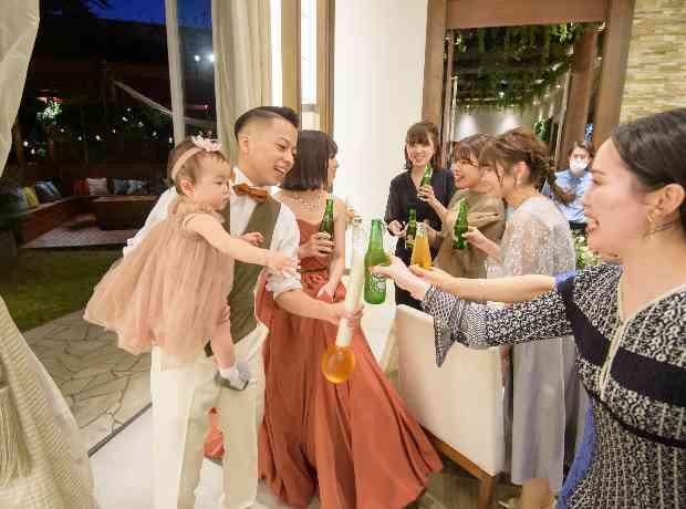 とにかく一生に一度のご結婚式をご友人・親族・家族みんなでめいいっぱい楽しみたい! 全員の笑顔があふれる最高の一日にしたいというお気持ちから、グランピングウェディングをすると希望して頂いたお2人。当日は新郎様ご入場時ゲスト様から自然と温かい拍手と笑みがこぼれ、 ご新婦様の可愛らしい笑顔とお子様の笑顔に会場全体が胸を打たれるスタートに。