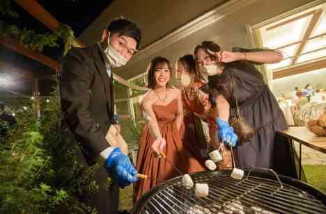 ガーデンを使ったグランピングウエディングというスタイル。披露宴でお色直しをされたタイミングからはゲストも自由にお二人のもとへ進んだり、ガーデンに並んだグランピングブッフェを楽しんだり、ゲストのご友人と一緒に焼きマシュマロを楽しんだりと楽しみ方は様々!地元の仲良しグループで一緒に写真に残せたり集まれる結婚式の魅力を最大限活かしたスタイルでお二人のご披露宴は進んでいきました!