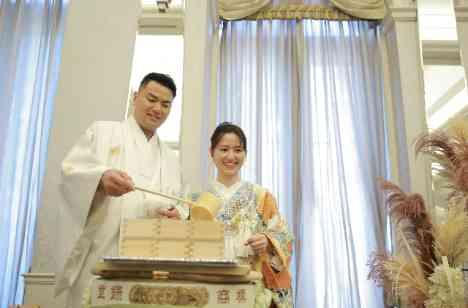 せっかくの和装姿での披露宴でしたので、ケーキカットの演出の代わりに、鏡開を行い、ゲストみんなと枡と日本酒で乾杯を行いました。 いまだとあまり見る機会も少なくなった演出ではじめて目にしたゲストもいたのと会食がはじまってからもみんな飲みにきてくれたので、行って良かった演出のひとつになりました。ぜひ検討中のカップルにはオススメです!