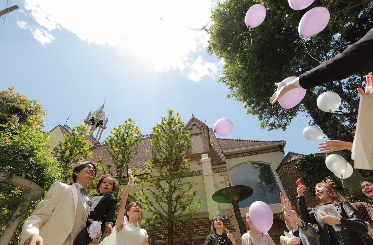 天候にも恵まれ、ガーデンでのデザートビュッフェ、バルーンリリースなどを行いました。そのほかに、シャンパンオープンのセレモニーたケーキカットもガーデンで行い、アットホームなパーティになるよう心がけました。