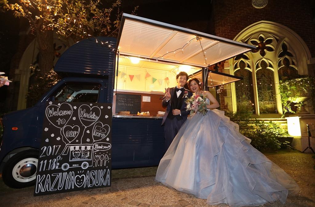 パーティ後半は、イルミネーションもきれいなガーデンでのデザートブッフェをサプライズで用意しました。