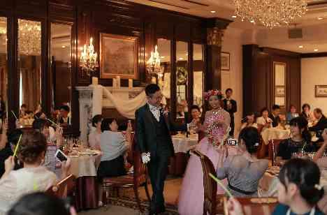 再入場の演出には、ふたりの大好きなBGMにあわせて、ゲストのみんなにもルミカライトを振ってもらい入場しました。LIVEも大好きなので、とても盛り上がりいい雰囲気の中で再入場ができました。その後のドレス色当てクイズもとっても盛り上がりました。