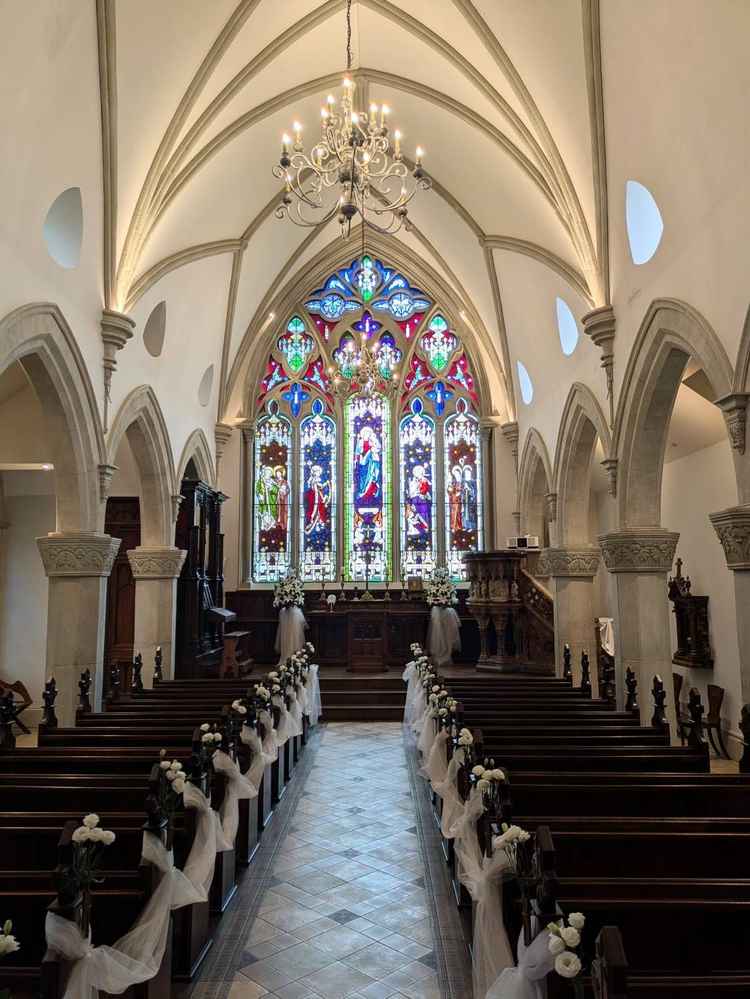 ステンドグラスのチャペルや英国風のバンケットをはじめ、外観やガーデンなど、式場全体が小さな村のようで世界観が作り上げられていました。