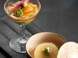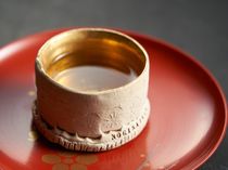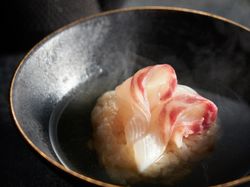 出汁は日本料理を作る上での、礎。手間を惜しまず、毎日一番良い状態を確認し丁寧に出汁をとります。お食事の始まりの出汁をまず一口お楽しみ下さい。お米は、乃木神社の神饌田で育てた特別な神饌米を振る舞います。 -