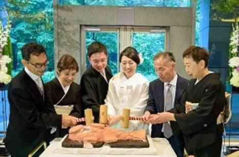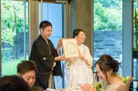 新緑を思わせるグリーンの装花に、プロによるジャズ演奏。ふたりは番傘を手に庭園から入場し、ゲストの承認で完成させた、リースデザインの結婚証明書を披露した。続いて登場したのは、大きな鯛の塩釜焼き。両親と一緒に木槌で開き、両家の絆が深まるひと時に。「こだわっていたゲスト参加の演出を叶えられて大満足です」。
