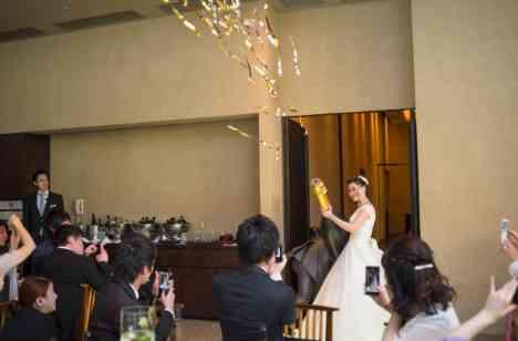 ゲストの皆さんへサプライズもかねてインパクトのあるジャンボクラッカーを用意して、再入場した差に、打ち上げました。 天井が高い披露宴会場なので、思いっきり上に放つことができ、とてもいい演出になりました!