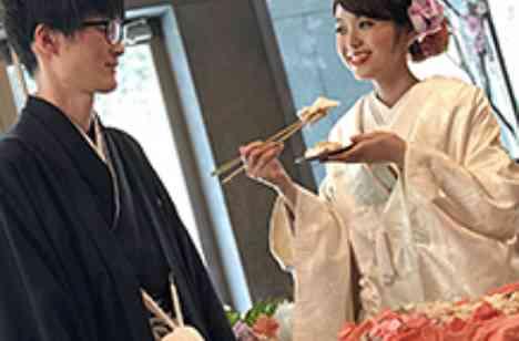新鮮な素材の風味がきいた鯛料理に感動し、「ぜひ皆様にも味わってほしい」と、鯛の塩釜開きを披露。開いた鯛は、鯛茶漬けか鯛めしなど、好きなメニューを選べるところも大好評!さらにテラスでデザートビュッフェも開催し、春風の中、ゲストとの交流を満喫。「旬の美食と楽しい演出で、喜ばれる披露宴になりました」。