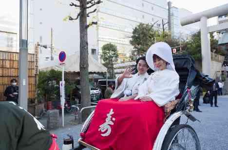 挙式は親族のみで行い、家のつながりを感じていただく時間にしました。 天候にも恵まれ、より結びつきを感じる挙式となりました。 また、芝大神宮ではオリジナルセレモニーである 「幸合わせ福結びの儀」があり、おふたりにとって 印象深い時間となりました。 神社からの移動は人力車で行い、 結婚式ならではの特別な時間をおふたりに過ごしていただきました。