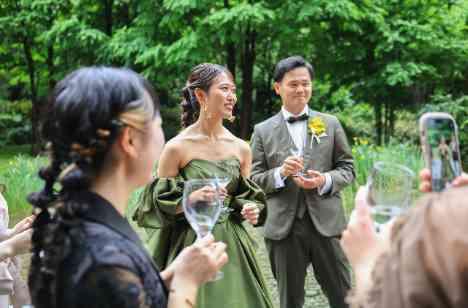 緑の庭園でお酒を楽しむ、アットホームな結婚式