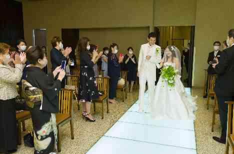 参列席にゆとりを持ち、ゲスト同士のソーシャルディスタンスにも配慮した、会場内での人前式。オリジナルの誓いの言葉や指輪交換、ゲストに土を入れてもらった鉢にベンジャミンの木を植える植樹セレモニーを執り行い、晴れて夫婦に。「挙式の司会を友人にお願いし、とても温かな雰囲気で盛りあげてくれて嬉しかったです」。