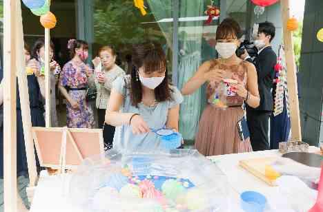 挙式後は隣接のテラスで、夏祭り風のウエルカムパーティ!かき氷や駄菓子、ピンポンボールやヨーヨーすくいといったミニゲームなど、3つもの屋台が登場。「今年はお祭りが中止になった地域も多く、皆様に縁日の気分を楽しんでいただきたいと思って用意しました。お面やラムネなど、懐かしさを誘うアイテムも好評でした」。