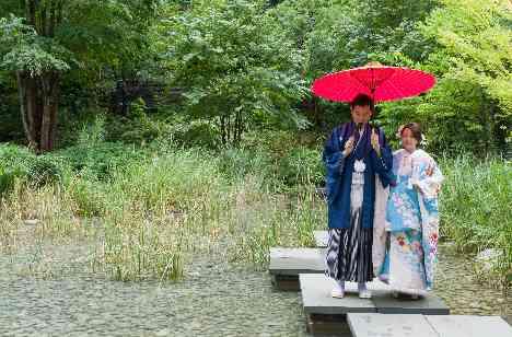 新婦は色打掛にお色直しし、紋付袴の新郎と共にテラスから再入場。くじ引きで当たったゲストと塩釜開きを行い、全員対象のプレゼントタイムでも盛りあげた。「再度テラスに出る時間を設け、デザートビュッフェやゲームを楽しんでもらいました。私たちもかき氷を食べたり、ビュッフェをつまんだりと満喫しましたよ」。