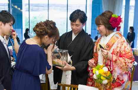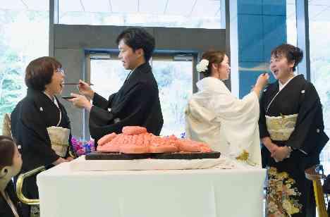 和装での神前式、披露宴を行ったおふたり。ゲストへの和食のご提供はもちろんのこと、和の演出にもこだわりました。ゲストの前で豪快に開いた大きな鯛の塩釜をその場でほぐし、これまで大切に育ててくれたご両家お母様へ感謝の気持ちを伝えるサンクスバイト。あつあつのほぐし身と共に、会場全体もあたたかい雰囲気に包まれました。