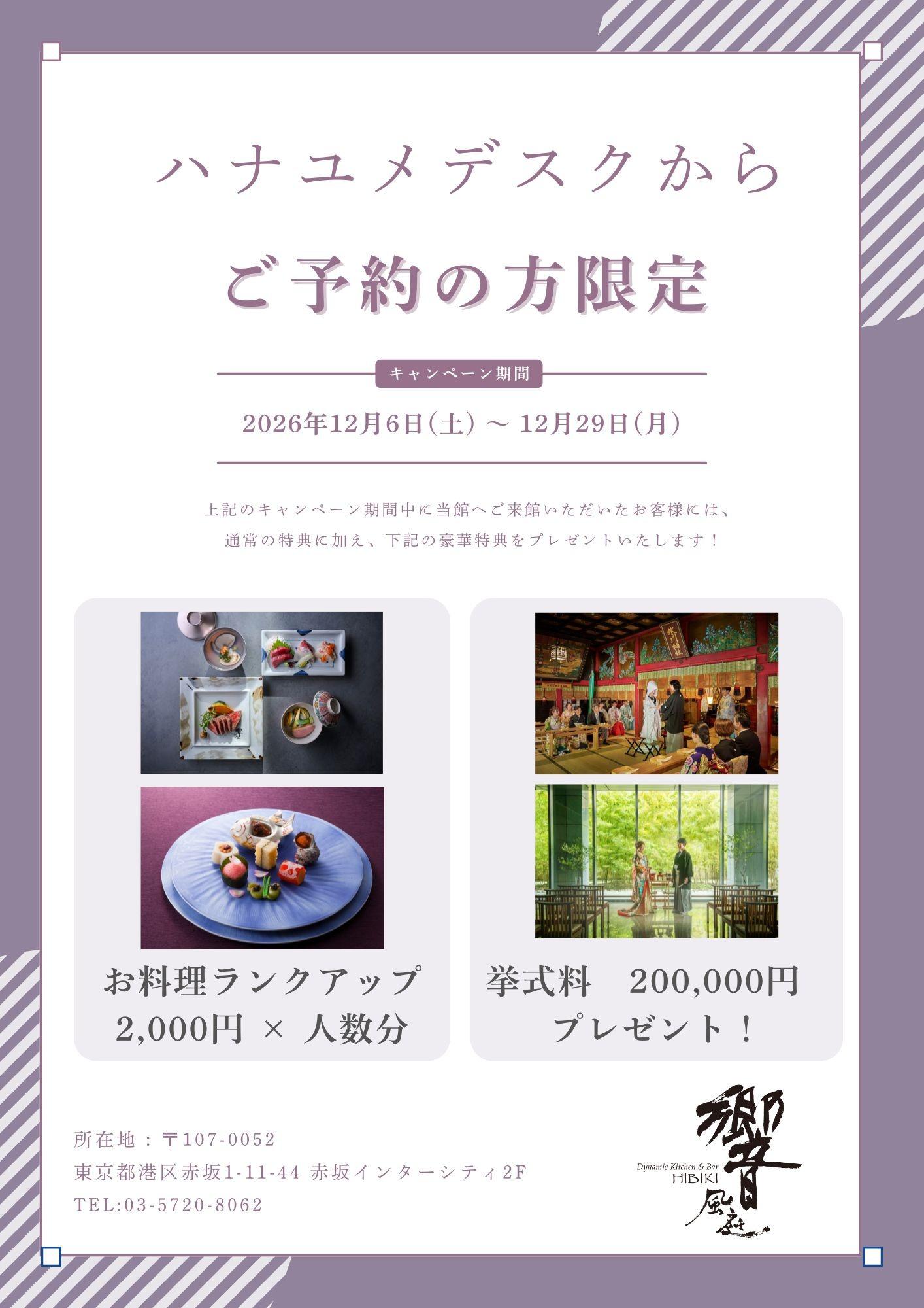 会場をまるっと見学したり、国産牛や鯛めしなどの和のフルコース試食など、響 風庭 赤坂を堪能できる豪華フェアを開催中!≪最大2万円分の来館特典や最大130万円相当の成約特典付き≫