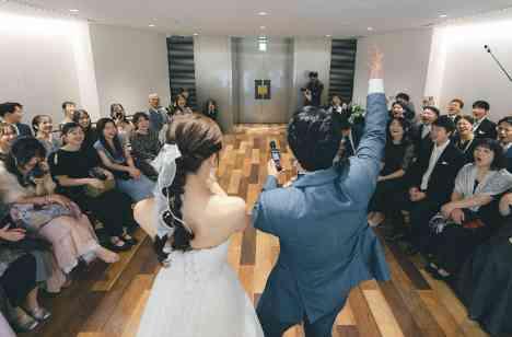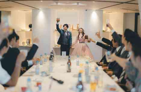 「感動的になりやすいシーンは全て明るく」というおふたりのご希望から、パーティの結びにはワンモアチアーズをご提案させて頂きました。 チアーズは「乾杯」以外にも「ありがとう」という意味もあるため、ゲスト一人ひとりと乾杯をして頂きながらおふたりらしい感謝をお伝えしながらのご退場になりました。 これからも続くおふたりの明るい未来にもう一度乾杯!!!