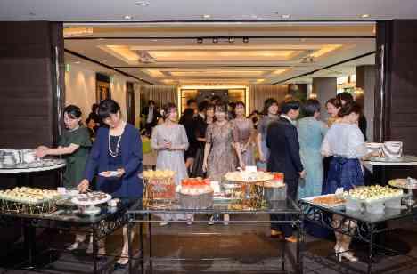 お二人からゲストの皆様へのサプライズプレゼントとして、デザートビュッフェをご準備。お席に座って楽しんでもらうだけでなく、移動して楽しんでいただくことも準備したいとの思いでご用意。ご披露宴会場から繋がっているホワイエスペースを使用し、パティシエ自慢のデザートをご用意。皆様とても嬉しそうにお好みのデザートを召し上がられ笑顔が絶えないひと時。