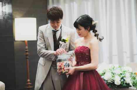ご披露宴のテーブルにはカードとペン。 皆様におふたりへのメッセージを綴って頂きました。 お色直し後おふたりが再入場。皆様のテーブルに訪れた際に瓶に入れていただきます。その際に皆様への感謝の気持ちを一人ひとりにお伝えしている素敵なおふたり。 温かいメッセージで一杯の瓶。世界にひとつだけの宝物の完成です。