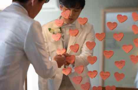 ご結婚式当日のお仕度中、ご新郎様がお仕度をするブライズルームの鏡には、ご新婦様からのサプライズが。ハートの付箋にご新郎様の好きなところを一言ずつ書いて、大きなハートをつくるように鏡に貼ったご新婦様。普段照れくさくて言えないところもご結婚式当日だからこそとご新婦様からご新郎様へメッセージを伝えました。