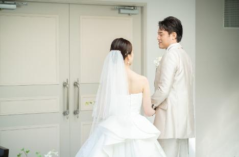 チャペルでのおふたりのファーストミートを終え、続いてはご家族様とのファミリーミート。 ご結婚式当日まで、ご両家ご家族様には御衣裳の詳細を内緒にしていたおふたり。チャペルの扉の向こう側にはご家族様がスタンバイ中で、緊張のドキドキと、親御様の反応が楽しみでワクワクしている瞬間です。ご家族様との時間も大切にしたいという思いから、挙式の前にしっかりとお時間を取り、おふたりの晴れ姿をお披露目しました。