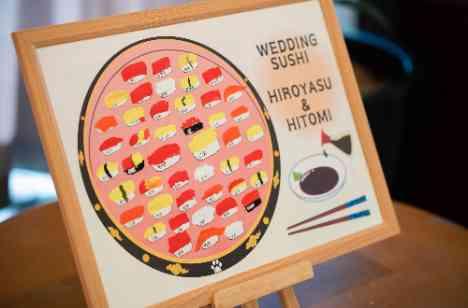 人前式スタイルで挙式をするにあたって、ゲストの皆さまと一緒に作成するオリジナルの結婚証明書をご用意。お寿司が大好きなおふたりは、「夫婦円満の秘訣は?」という質問を問いかけ、4択でゲストの皆さまがそれぞれ思うものに該当する色をお寿司のネタの部分に塗ってもらうことで、ゲストの皆さまが参加できるように工夫しました。